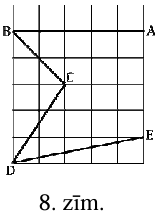 Rūtiņu lapā rūtiņu virsotnēs atzīmēti punkti \(A, B, C, D, E\) un novilkti nogriežņi \(AB, BC, CD\) un \(DE\) (skat. 8.zīm.). Kurš no leņķiem \(\sphericalangle ABC\) un \(\sphericalangle CDE\) ir lielāks?