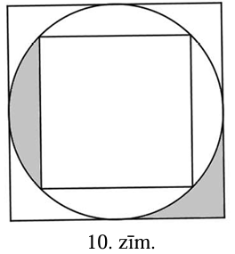 Kvadrātā, kura malas garums ir \(2\), ievilkts riņķis un šajā riņķī ievilkts kvadrāts (skat. 10.zīm.). Aprēķināt iekrāsoto daļu laukumu summu!