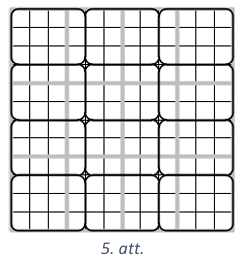 Kvadrāts ar izmēriem \(12 \times 12\) rūtiņas divos veidos ir sadalīts taisnstūros ar izmēriem \(3 \times 4\) rūtiņas (skat. 5.att.): trīs rindās pa četriem taisnstūriem katrā (ar gaiši pelēkajām līnijām) un četrās rindās pa trim taisnstūriem katrā (ar melnajām līnijām). Kāds ir mazākais rūtiņu skaits, kas jāiekrāso \(12 \times 12\) rūtiņu kvadrātā, lai katrā gaišpelēkajā un katrā melnajā taisnstūrī būtu vismaz viena iekrāsota rūtiņa?