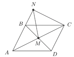 Dots, ka \(AB \| CD\) un \(AD \| BC\) (skat. 9.att.). Nogriežņu \(AC\) un \(BD\) krustpunkts ir \(M\). Uz taisnes \(AB\) izvēlēts tāds punkts \(N\), ka \(AM=MN\). Pierādīt, ka \(\sphericalangle ANC=90^{\circ}\).