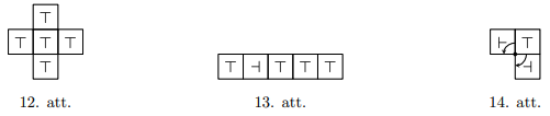 Dotas piecas smagas kastes un tās izkārtotas, kā tas redzams 12. att. Šīs kastes var pārvietot tikai pagriežot par 90 grādiem ap kādu no kastes stūriem. Kastes nav iespējams pārvietot citām kastēm virsū. Pēc vairākiem šādiem pārvietojumiem šīs kastes tika izkārtotas, kā tas redzams 13. att. Kuras no šīm kastēm varēja sākotnēji atrasties 12. att. izkārtojuma centrā? Piemēru, kā kasti var pārvietot ap vienu stūri divos dažādos veidos skatīt 14. att.