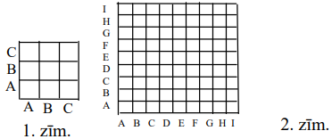 (A) Vai var 1.zīm. parādītās tabulas rūtiņās ierakstīt naturālus skaitļus no \(1\) līdz \(9\) (katrā rūtiņā - citu skaitli) tā, lai izpildītos īpašība: ja rinda un kolonna apzīmētas ar vienādiem burtiem, tad tajās ierakstīto skaitļu reizinājumi ir vienādi?