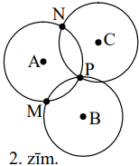 Trīs vienādas riņķa līnijas krustojas punktā \(P\). Apzīmējam riņķa līniju centrus un divus no pārējiem krustpunktiem, kā parādīts 2.zīm. Pierādīt, ka \(MNCB\) ir paralelograms.