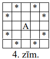 (Ja šaha zirdziņš atrodas rūtiņā \(A\), tad tas apdraud visas ar \(\ast\) apzīmētās rūtiņas, skat. 4.zīm.)