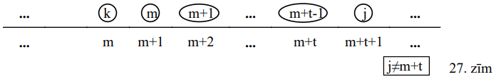 C. Radusies situācija, kad \(t\) sējumi, kas ir pa labi no \(k\)-tā sējuma pašreizējās pozīcijas, atrodas vienu vietu pa labi no savas īstās vietas, bet \((t+1)\)-ais sējums - nē (27.zīm.):