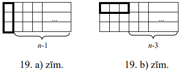 Apskatām taisnstūri ar izmēriem \(3 \times n\). Pirmo taisnstūrīti \(1 \times 3\) varam novietot a) "vertikāli" (skat. 19. a) zīm.) vai b) "horizontāli" (skat. 19. b) zīm.). a) gadījumā neaizpildīts paliek taisnstūris \(3 \times(n-1)\), ko var aizpildīt \(f_{n-1}\) veidos. b) gadījumā vēl divi taisnstūriši \(1 \times 3\) jānovieto "horizontāli" (nevienu "vertikāli" ievietot nav iespējams), tad neaizpildīts paliks taisnstūris \(3 \times(n-3)\), ko var aizpildīt \(f_{n-3}\) veidos.