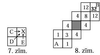Pakāpeniski aprēķināsim, cik veidos zilonis var nokļūt katrā rūtiņā. Ievērosim: ja rūtiņās \(C, D\) un \(E\) var nokļūt attiecīgi \(c, d\) un \(e\) veidos, tad rūtiņā \(X\) var nokļūt \(x=c+d+e\) veidos (skat. 7.zīm.). Tātad no rūtiņas \(A\) rūtiņā \(B\) var nokļūt \(32\) veidos (skat. 8.zīm.).