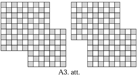 Nē, prasīto izdarīt nevar. Ir divi dažādi veidi, kā no kvadrāta pretējiem stūriem var izgriezt \(3 \times 5\) rūtiņu taisnstūrus: 1) viens novietots horizontāli, otrs- vertikāli, 2) abi novietoti vienā virzienā. Iekrāsosim atlikušo figūru kā šaha galdiņu. Neatkarīgi no tā, kā ir izgriezti taisnstūri, figūrā ir \(58\) melnas un \(56\) baltas rūtiņas (skat. A3.att.). Lai kur novietotu domino kauliņu, tas vienmēr pārklās tieši vienu melnu un tieši vienu baltu rūtiņu. Līdz ar to \(57\) domino kauliņi pārklās vienāda skaita melno un balto rūtiņu. Iegūta pretruna, jo figūrā nav vienāds skaits melno un balto rūtiņu.