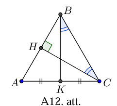 Tā kā \(BK=HC, \sphericalangle KBC=\sphericalangle HCB\) un \(BC\) -- kopīga mala (skat. A12.att.), tad \(\triangle BCK=\triangle BCH\) pēc pazīmes " \(m \ell m\) ". Līdz ar to \(\sphericalangle BKC=\sphericalangle CHB=90^{\circ}\) (kā atbilstošie leņķi vienādos trijstūros) un \(BK\) ir augstums no virsotnes \(B\) pret malu \(AC\). Tā kā \(AK=KC\), \(\sphericalangle AKB=\sphericalangle KBC=90^{\circ}\) un \(BK\)- kopīga mala, tad \(\triangle AKB=\triangle BCK\) pēc pazīmes " \(m \ell m\) ". No kā izriet, ka \(\sphericalangle ABK=\sphericalangle KBC\). Izmantojot trijstūra iekšējo leņķu summu, iegūstam
