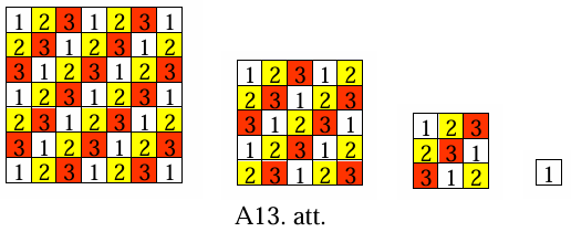 Katru slāni izkrāsosim trīs krāsās diagonālveidā (skat. A13.att.). Katrs bloks ar izmēriem \(1 \times 1 \times 3\) satur visas trīs krāsas, tāpēc visi bloki kopā satur vienāda skaita katras krāsas kubiņu. Tā kā tornis satur \(29\) vienības kubiņus krāsā \(1\), \(28\)- krāsā \(2\), \(27\)- krāsā \(3\), tad torni nevar salikt no blokiem ar izmēriem \(1 \times 1 \times 3\).