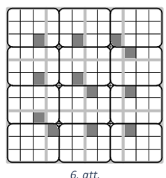 Tā kā katrā melnajā taisnstūrī ir jābūt vismaz vienai iekrāsotai rūtiņai, tad kopā jābūt vismaz \(12\) iekrāsotām rūtiņām. Ar \(12\) iekrāsotām rūtiņām pietiek, lai izpildītos uzdevuma nosacījumi, skat., piemēram, 6.att.