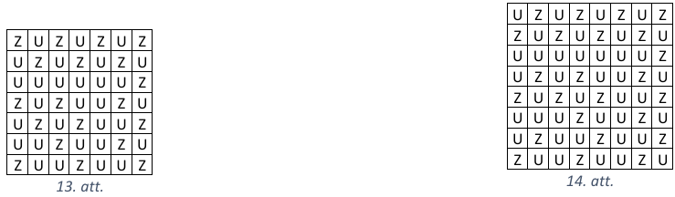 Analizēsim spēli no beigām. Skaidrs, ka laukuma labā augšējā stūra rūtiņa ir zaudējoša, jo no tās nevar izdarīt gājienu. Tālāk laukuma rūtiņas aizpildīsim pēc šāda principa: ja kāds no iespējamajiem gājieniem pārvieto kauliņu uz zaudējošu rūtiņu (apzīmējam ar \(Z\)), tad šī rūtiņa ir uzvaroša (apzīmējam ar \(U\)). Pretējā gadījumā rūtiņa ir zaudējoša. Tādā veidā aizpildot rūtiņas, iegūstam, ka gan (A), gan (B) gadījumā sākuma (kreisā apakšējā stūra rūtiņa) ir zaudējoša, skat. attiecīgi 13.att. un 14.att.