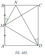 Tā kā \(M\) ir \(AB\) viduspunkts, tad simetrijas dēļ \(CM=MD\) (skat. 16.att.). Tad pietiek pierādīt, ka \(MD=CD\). Trijstūri \(BMN\) un \(CDN\) ir līdzīgi pēc pazīmes \(\ell \ell\), jo \(\sphericalangle MBN=\sphericalangle DCN=90^{\circ}\) un \(\sphericalangle BMN=\sphericalangle CDN\) pēc dotā. Trijstūru līdzības koeficients ir \(\frac{BM}{CD}=\frac{1}{2}\), tāpēc \(CN=2BN\). Bet \(MN=2BN\), jo katete pret \(30^{\circ}\) leņķi ir puse no hipotenūzas. Tāpēc \(\quad MN=CN\). Tā kā \(\quad \sphericalangle BNM=\sphericalangle CND=90^{\circ}-30^{\circ}=60^{\circ}\), tad \(\sphericalangle MND=180^{\circ}-\sphericalangle BNM-\sphericalangle CND=60^{\circ}\). Ievērojot, ka \(ND\) ir trijstūru \(MND\) un \(CND\) kopīga mala, iegūstam, ka \(\triangle MND=\triangle CND\) pēc pazīmes \(m \ell m\). Tad \(MD=CD\). Līdz ar to esam pierādījuši, ka \(MD=CD=CM\) jeb trijstūris \(CDM\) ir vienādmalu.