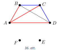(A) Pierādīsim, ka vienmēr būs vismaz viens vienkrāsas trijstūris. Pieņemsim, ka nav neviena vienkrāsas trijstūra. Aplūkojam patvaļīgu sešstūra virsotni \(A\). Tā kā no tās iziet \(5\) nogriežņi, tad vismaz trīs no tiem ir vienā krāsā (Dirihlē princips). Nezaudējot vispārīgumu, uzskatīsim, ka nogriežņi \(\textcolor{red}{AB}, \textcolor{red}{AC}, \textcolor{red}{AD}\) ir sarkanā krasā. Tad \(\textcolor{blue}{BC}\) un \(\textcolor{blue}{CD}\) jābūt zilā krāsā un viens no trijstūriem \(ABD\) vai \(BCD\) ir vienkrāsas trijstūris (skat. 36.att.). Iegūta pretruna ar pieņēmumu.