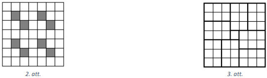 Jāiekrāso \(8\) rūtiņas, skat., piemēram, 2.att. Nepietiek iekrāsot mazāk kā \(8\) rūtiņas, jo kvadrātā \(7 \times 7\) rūtiņas var izvietot astoņus taisnstūrus ar izmēriem \(2 \times 3\) rūtiņas (skat. 3.att.).
