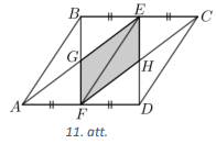 Novelkam nogriezni \(EF\), tas sadala doto paralelogramu \(ABCD\) divos vienādos paralelogramos \(ABEF\) un \(FECD\), jo to pretējās malas ir paralēlas un vienādas. Nogriežņu \(BF\) un \(AE\) krustpunktu apzīmējam ar \(G\), bet \(ED\) un \(CF\) krustpunktu - ar \(H\), tad jāaprēķina četrstūra \(FGEH\) laukums (skat. 11.att.).