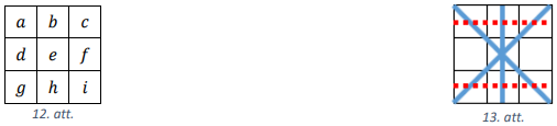 No tā, ka katrā rindā ierakstīto skaitļu summa ir viena un tā pati, var secināt, ka tā ir \(\frac{1+2+3+4+5+6+7+8+9}{3}=15\). Tā kā arī katrā kolonnā un katrā diagonālē ierakstīto skaitļu summa ir \(15\), tad iegūstam, ka \(a+b+c=d+e+f=g+h+i=a+d+g=b+e+h=c+f+i=a+e+i=c+e+g=15\). Ievērojam (skat. 13.att.), ka