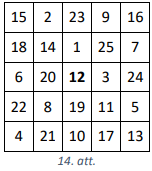 Tātad esam pierādījuši, ka centrālajā rūtiņā vienmēr ir ierakstīts skaitlis \(5\). **(B)** Nē, nevar apgalvot. Centrālajā rūtiņā būtu jābūt \(13\), bet ir iespējams izveidot maģisko kvadrātu, kura centrālajā rūtiņā nav skaitlis \(13\), bet gan ir skaitlis \(12\), skat., piemēram, 14.att., kur atbilstošā summa ir \(65\).