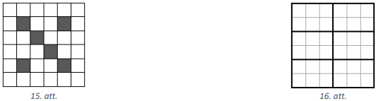 Pierādīsim, ka nepietiek iekrāsot mazāk rūtiņu. Sadalām kvadrātu sešos taisnstūros \(2 \times 3\) (skat. 16.att.), katrā šādā taisnstūrī jābūt iekrāsotai vismaz vienai rūtiņai, tātad kopā jābūt iekrāsotām vismaz \(6\) rūtiņām.