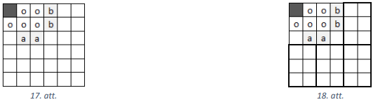 (B) Pierādīsim, ka visas stūra rūtiņas paliks neiekrāsotas. Pieņemsim, ka kāda stūra rūtiņa ir iekrāsota, piemēram, labā stūra augšējā rūtiņa, tad ar "\(o\)" atzīmējam tās rūtiņas, ko nedrīkst iekrāsot (lai pietiktu ar \(6\) iekrāsotām rūtiņām, katrā 16.att. taisnstūrī \(2 \times 3\) jāiekrāso tieši viena rūtiņa un tā kā stūra rūtiņa jau ir iekrāsota, tad pārējās piecas rūtiņas iekrāsot nedrīkst), bet noteikti jāiekrāso tieši viena rūtiņa, kas atzīmēta ar "\(a\)" un tieši viena - kas atzīmēta ar "\(b\)" (skat. 17.att.). Kopā ir iekrāsotas jau \(3\) rūtiņas. Atlikušo kvadrāta daļu var sadalīt četros taisnstūros \(2 \times 3\) (skat. 18.att.), bet katrā šādā taisnstūrī ir jāiekrāso vismaz viena rūtiņa, tātad kopā būs jāiekrāso vismaz \(7\) rūtiņas. Tā kā mazākais rūtiņu skaits, kas jāiekrāso, ir \(6\), tad stūra rūtiņas paliek neiekrāsotas.