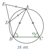 Apzīmējam \(\sphericalangle ACB=\sphericalangle CBA=\alpha\) (skat. 19.att.). Tā kā četrstūris \(ACBD\) ir ievilkts riņķa līnijā, tad tā pretējo leņķu summa ir \(180^{\circ}\), tātad \(\sphericalangle ADB=180^{\circ}-\sphericalangle ACB=180^{\circ}-\alpha\). Izmantojot blakusleņķu īpašību, iegūstam \(\sphericalangle ADE=180^{\circ}-\sphericalangle ADB=180^{\circ}-\left(180^{\circ}-\alpha\right)=\alpha\). Tā kā \(AD=AE\), tad \(\sphericalangle ADE=\sphericalangle DEA=\alpha\). Līdz ar to \(\triangle ABC \sim \triangle AED\) pēc pazīmes \(\ell \ell\).