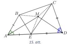 Uz malas \(AD\) atliekam punktu \(E\) tā, ka \(AE=AB\) (skat. 15.att.). Tā kā pēc dotā \(AD=AB+CD\), tad \(ED=CD\). Tātad trijstūri \(BAE\) un \(CDE\) ir vienādsānu trijstūri un attiecīgi bisektrise \(AM\) un \(DM\), kas vilktas no virsotnes leņķa, ir arī mediāna un augstums jeb attiecīgi nogriežņu \(BE\) un \(CE\) vidusperpendikuli. Ja punkts atrodas uz nogriežņa vidusperpendikula, tad tas atrodas vienādā attālumā no nogriežņa galapunktiem. Tātad \(MB=ME\) un \(ME=MC\) (jo \(M\) atrodas uz nogriežņa vidusperpendikula), no kā izriet, ka \(MB=MC\).