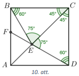 Novelkam nogriezni \(BE\) (skat. 10.att.). Ievērojam, ka \(\triangle DCE=\triangle BCE\) pēc pazīmes \(m \ell m\), jo \(DC=BC\), \(\sphericalangle ECD=\sphericalangle ECB\), \(EC\) - kopīga. Tā kā vienādos trijstūros attiecīgie elementi ir vienādi, tad \(\sphericalangle BEC=\sphericalangle DEC=75^{\circ}\) un \(\sphericalangle CBE=\sphericalangle CDE=60^{\circ}\).