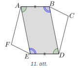 Tā kā dotā sešstūra pretējās malas ir paralēlas, tad \(\sphericalangle ABC=\sphericalangle DEF\) un \(\sphericalangle CDE=\sphericalangle FAB\) kā leņķi ar paralēlām malām. Tātad iegūstam: