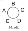 Pieņemsim, ka ir kāds deputāts, kas ienīst divus citus deputātus. Nosēdināsim šo deputātu vietā A (skat. 14. att.) un tos, ko vinš ienīst -- vietās \(C\) un \(D\) (tālāk sauksim šos deputātus attiecīgi par \(A, C\) un \(D\)). Ievērosim, ka visi trīs šie deputāti neienīst nevienu no abiem pārējiem. Patiešām, tā kā \(A\) un \(C\) ienīst viens otru un \(A\) ienīst vēl arī \(D\), tad tie ( \(A\) un \(C\) ) nevar ienīst vairs nevienu citu. Tādu pašu spriedumu var izveikt arī par \(A\) un \(D\). Tātad, abus atlikušos deputātus nosēdinot vietās \(B\) un \(E\), prasītais ir panākts.