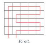 Konstruētais maršruts noslēgsies rūtiņā \((m;2)\). Tālāk vedam maršrutu uz \((m;1)\) un attiecīgi \((1;1)\) pa pirmo kolonnu. Redzams, ka maršruts apmierina uzdevuma nosacījumu. Maršruta piemērs redzams 16. att. ar vērtībām \(m=4\) un \(n=5\).