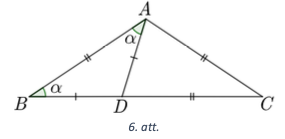 Tā kā \(AD=BD\), tad trijstūris \(ABD\) ir vienādsānu trijstūris ar pamatu \(AB\) un tā pamata pielenķi ir vienādi, tātad \(\sphericalangle ABD=\sphericalangle BAD=\alpha\) (skat. 6. att.).