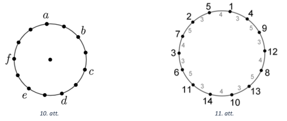 Ievērosim, ka skaitļi \(1\); \(2\); \(3\); \(11\); \(12\) un \(13\) nevar būt uzrakstīti blakus viens otram, jo katru divu skaitļu starpība nav \(3\); \(4\) vai \(5\). Tātad tos jāraksta, izlaižot vienu pozīciju, tādējādi rodas tikai divas blakus vietas, kurās nav ierakstīti skaitļi (skat. 10.att.).
