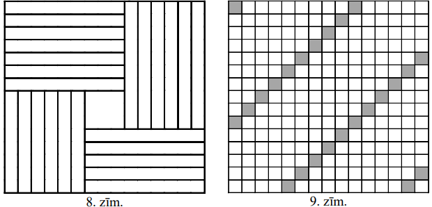 (B) viegli redzams, ka katram taisnstūrim jāsatur tieši viena iekrāsota rūtiņa (9.zīm.). Tā kā šādu rūtiņu ir \(24\), tad vairāk par \(24\) taisnstūriem izgriezt nevar.