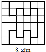 Apzīmēsim katra veida figūru skaitu ar \(k\); tad tās kopā satur \(4k+5k=9k\) rūtiņas. Iegūstam vienādību \(9k=n^{2}\), tātad \(n\) dalās ar \(3\). Mazākās iespējamās \(n\) vērtības ir \(n=3\) un \(n=6\). Vērtība \(n=3\) acīmredzami neder. Atrisinājumu pie \(n=6\) skat. 8.zīm.