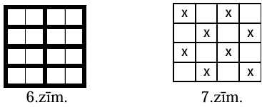 Kā redzam 6.zīm., \(32\) nogriežņus var nokrāsot. Katrai no 7.zīm. atzīmētajām rūtiņām var nokrāsot ne vairāk kā \(3\) malas; pieskaitot vēl \(8\) atlikušos nogriežņus uz kvadrāta kontūra, iegūstam, ka \(8 \cdot 3+8=32\) tiešām ir maksimums.