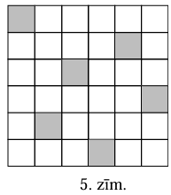 \(6 \times 6\) rūtiņas lielā kvadrātā izkrāso sešas rūtiņas tā, lai no tā nevarētu izgriezt ne taisnstūri \(1 \times 6\) rūtiņas, ne kvadrātu \(3 \times 3\) rūtiņas, kam visas rūtiņas ir neizkrāsotas.