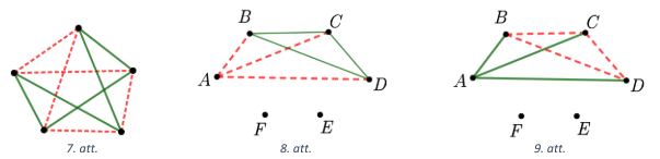 Apskatām punktu \(A\). No tā iziet vismaz \(3\) vienas krāsas nogriežņi, jo katri divi rūķi vai nu draudzējas, vai ir ienaidnieki un no viena punkta iziet \(5\) nogriežņi (pēc Dirihlē principa). Apskatām abus iespējamos gadījumus, kādā krāsā var būt nogriežņi \(AB\), \(AC\) un \(AD\).