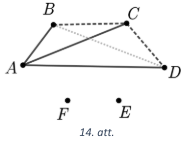 Pieņemsim, ka nav neviena šāda trijstūra. Aplūkojam punktu \(A\). Tā kā no tā iziet \(5\) nogriežņi, tad vismaz trīs no tiem ir viena veida (pēc Dirihlē principa). Nezaudējot vispārīgumu, uzskatīsim, ka nogriežņi \(AB, AC, AD\) ir nepārtrauktas līnijas. Tad \(BC\) un \(CD\) jābūt pārtrauktām līnijām, bet tādā gadījumā trijstūrim \(ABD\) vai \(BCD\) visas malas būs viena veida līnijas (skat. 14. att.). Iegūta pretruna ar pieņēmumu.