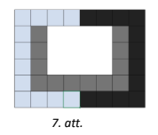 Parādi, kā 2.att. figūru (\(6 \times 8\) rūtiņu taisnstūris, no kura izgriezts \(3 \times 4\) rūtiņu taisnstūris), griežot pa rūtiņu līnijām, var sagriezt trīs vienādās figūrās! Figūras ir vienādas, ja tās var uzlikt vienu uz otras tā, ka abas figūras sakrīt (figūras var pagriezt un apmest otrādi).