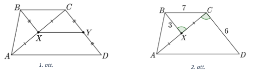 Tā kā \(BX \| CD\), tad \(\sphericalangle BXC = \sphericalangle ACD\) kā iekšējie šķērsleņķi pie paralēlām taisnēm (skat. 2.att.). No dotā izriet, ka \(\frac{BX}{CD}=\frac{CX}{AC}=\frac{1}{2}\). Tātad \(\triangle BXC \sim \triangle DCA\) pēc pazīmes \(m \ell m\). Līdz ar to \(AD=2BC=14\) kā atbilstošās malas līdzīgos trijstūros.
