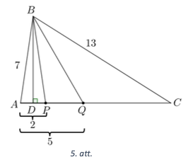 Izmantojot Pitagora teorēmu trijstūrī \(ADB\), iegūstam, ka \(BD^{2}=AB^{2}-AD^{2}=48\). Tā kā \(D P=A P-A D=2-1=1 \mathrm{~cm}\), tad pēc Pitagora teorēmas \(\triangle BDP\) iegūstam, ka \(BP=\sqrt{BD^{2} + DP^{2}} = \sqrt{48+1}=7 \mathrm{~cm}\). Tā kā \(D Q=A Q-A D=5-1=4 \mathrm{~cm}\), tad pēc Pitagora teorēmas \(\triangle BDQ\) iegūstam, ka \(BQ = \sqrt{BD^{2}+DQ^{2}} = \sqrt{48+16} = 8 \mathrm{~cm}\). *Piezīmes* 1. Augstumu \(B D\) var aprēkināt arī, izmantojot trijstūra laukumu (pēc Hērona formulas). 2. Vajadzīgos punktus var iegūt, mēǵinot kombinēt dažādus malu garumus, lai iegūtu, ka hipotenūzas garums ir vesels skaitlis.