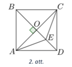 Apzīmējam diagonālu krustpunktu ar \(O\); apzīmējam \(BD=d\) un \(OE=x\). Diagonāle \(B D\) ir kvadrāta simetrijas ass, tāpēc \(EA = EC\) (skat. 2. att.).