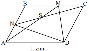 Dots, ka \(ABCD\) - paralelograms un \(AM=CN\) (skat. 1.zīm). Pierādīt, ka \(D\) atrodas uz \(\sphericalangle ASC\) bisektrises.