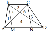 Uz trapeces \(ABCD\) garākā pamata \(AD\) ņemti tādi divi iekšēji punkti \(M\) un \(N\), ka \(BM \parallel CN\). Pierādīt, ka daļu \(1,\ 2\) un \(3\) laukumu summa vienāda ar daļas \(4\) laukumu (skat. 1.zīm.).