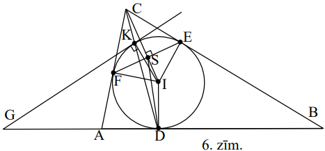 (B) pieņemsim, ka \(K\) ir nogriežņa \(CD\) un ievilktās riņķa līnijas kopējais punkts, kas atšķiras no \(D\). Taisne, kas punktā \(K\) pieskaras ievilktajai riņķa līnijai, krusto taisni \(AB\) punktā \(G\). Pierādīt, ka \(GS \perp CI\).
