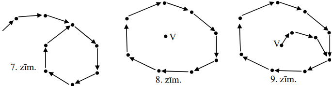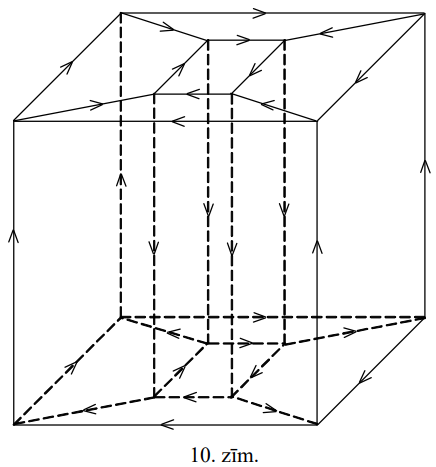 Otrajā gadījumā atrastais cikls ierobežo mazāku daļu nekā \(D\). Pirmajā gadījumā (skat. 8.zīm.) sākam iet no virsotnes \(V\) pa šķautnēm pretēji bultiņu virzieniem, kamēr nonākam kādā virsotnē, kas jau redzama 9.zīm.