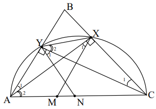 Tā kā \(\sphericalangle AYC=\sphericalangle AXC\), tad \(A,\ Y,\ X,\ C\) ir uz vienas riņķa līnijas. Tāpēc \(\sphericalangle YAX=\sphericalangle YCX\) un \(\sphericalangle XAC=\sphericalangle XYC\); \(\sphericalangle CYN=\sphericalangle YCX\) un \(\sphericalangle AXM=\sphericalangle YAX\) (iekšējie škērsleņķi). Tāpēc \(\sphericalangle NYX=\sphericalangle_{1}+\sphericalangle_{2}\) un arī \(\sphericalangle NMX=L_{1}+\sphericalangle_{2}\) (\(\triangle AMX\) ārējais leņķis). No \(\sphericalangle NYX=\sphericalangle NMX\) seko vajadzīgais.