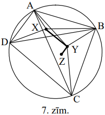 Ja \(X\) un \(Y\) ir attiecīgi \(\triangle ABD\) un \(\triangle ABC\) iecentri, tad \(\sphericalangle AYB=180^{\circ}-\frac{1}{2}(\sphericalangle BAC+\sphericalangle \mathrm{ABC})=90^{\circ}+\frac{1}{2} \sphericalangle ACB\) un līdzīgi \(\sphericalangle AXB=90^{\circ}+\frac{1}{2} \sphericalangle ADB\). Tā kā \(\sphericalangle ACB=\sphericalangle ADB\), tad \(\sphericalangle AYB=\sphericalangle AXB\). Tātad punkti \(A,\ X,\ Y,\ B\) atrodas uz vienas riņķa līnijas, tātad \(\sphericalangle XYB=180^{\circ}-\frac{1}{2} \sphericalangle DAB\). Ja \(Z\) ir \(\triangle BCD\) iecentrs, tad līdzīgi iegūstam \(\sphericalangle ZYB=180^{\circ}-\frac{1}{2} \sphericalangle DCB\) Tāpēc \(\sphericalangle XYZ=360^{\circ}-\sphericalangle XYB-\sphericalangle ZYB=\frac{1}{2}(\sphericalangle DAB+\sphericalangle DCB)=\frac{1}{2} \cdot 180^{\circ}=90^{\circ}\). Līdzīgi pierāda, ka arī citi vajadzīgie leņķi ir taisni.