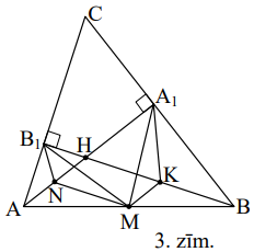 No viduslīniju īpašībām trijstūrī \(AHB\) iegūstam \(NM=\frac{1}{2} HB\) un \(KM=\frac{1}{2} AH\); tā kā mediāna pret hipotenūzu ir puse no hipotenūzas, tad \(B_{1}N=\frac{1}{2} AH=MK\) un \(A_{1}K=\frac{1}{2} HB=MN\), kā arī \(A_{1}M=\frac{1}{2} AB=B_{1}M\). Pielietojam pazīmi \(mmm\).