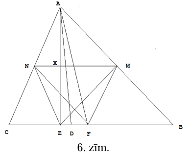 Ar \(E\) apzīmēsim no virsotnes \(A\) vilktā augstuma pamatu, ar \(F\)- malas \(BC\) viduspunktu. Pierādīsim, ka \(D\) atrodas starp \(E\) un \(F\) (vai ar tiem sakrīt, ja \(ABC\) ir vienādsānu trijstūris) (skat. 6.zīm.).
